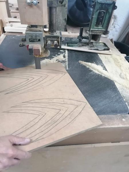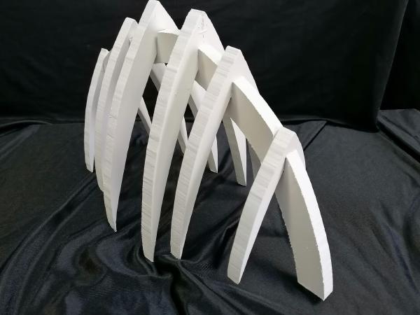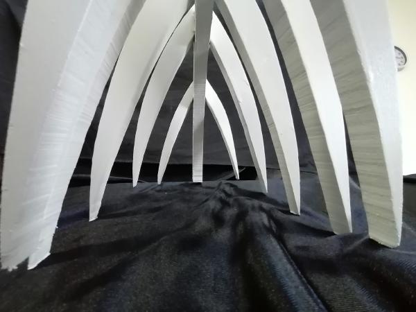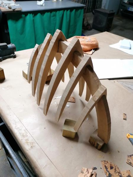 Obra feta amb restes de fusta. Amb un toc arquitectònic mostra una estructura feta de costelles.